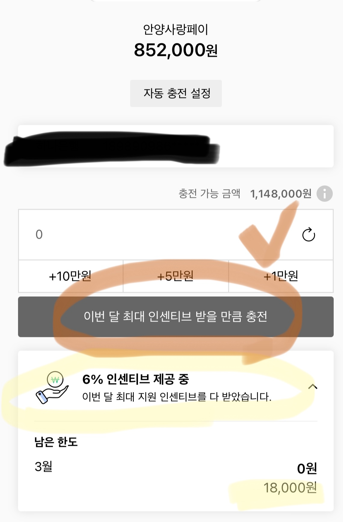 아래쪽에 현재 6%의 인센티브를 제공하고 있다고 설명되어 있으며, 3월 한도는 18,000원으로 표기되어 있습니다. 즉, 30만 원을 충전할 때 6%의 금액인 18,000을 할인받을 수 있다는 말입니다. 다만 2월까지는 처음부터 6%인 18,000원을 제외한 금액이 충전되었는데, 3월부터는 총 30만원을 충전하고 인센티브로 18,000원을 추가 지급하는 식으로 바뀌었습니다. 즉, 318,000원이 충전되었다고 표기됩니다.