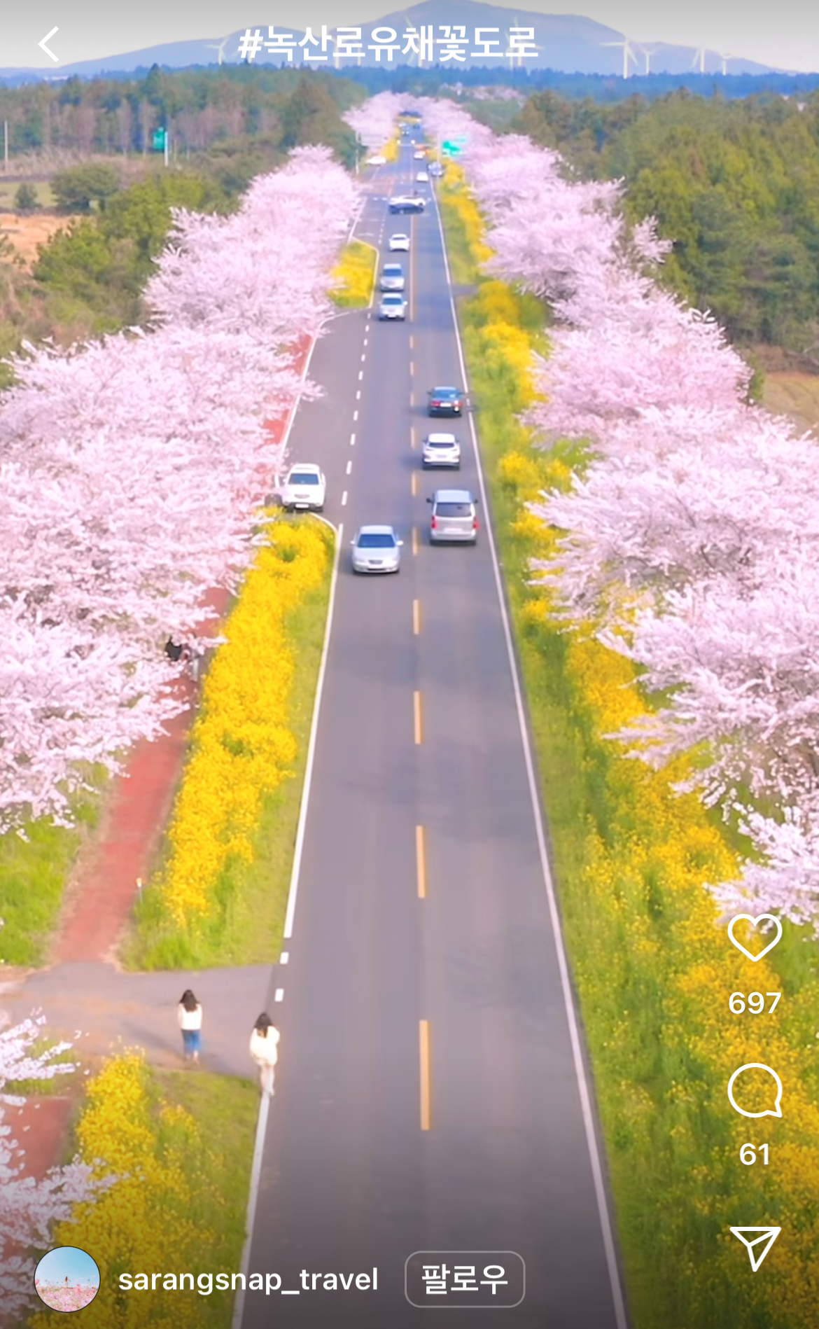 제주 서귀포시 녹산로 유채꽃도로 풍경 (출처: 왼쪽- 인스타그램 sarangsnap_travel)